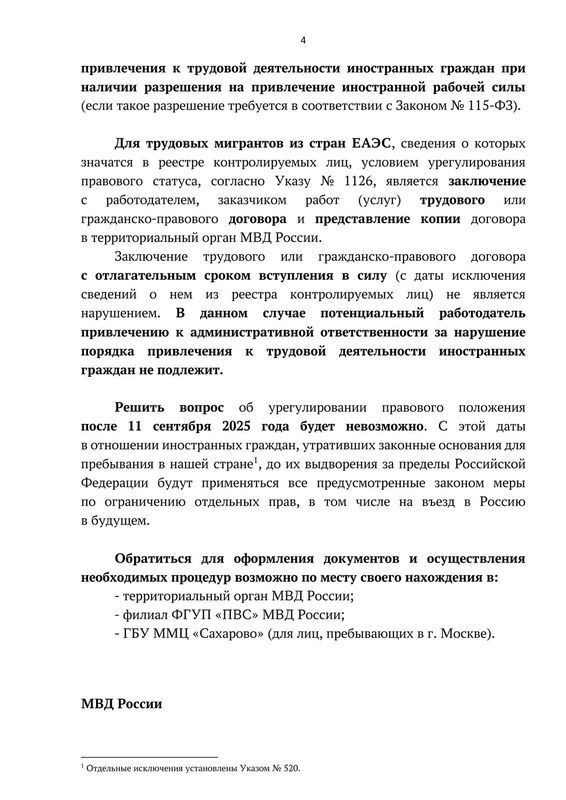После 11 сентября 2025 года урегулирование правового положения будет невозможно. В отношении иностранных граждан, не оформивших документы, будут применяться все предусмотренные законом меры, включая ограничение въезда в РФ.