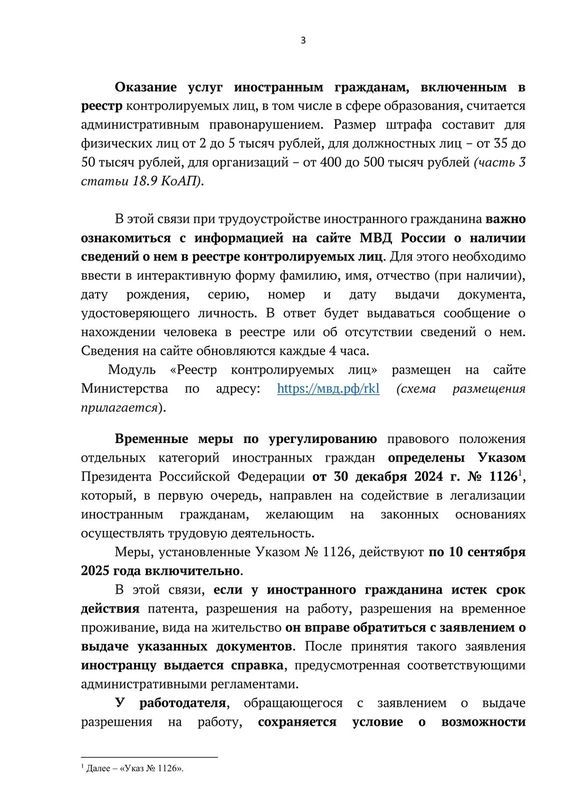 В соответствии с Указом Президента РФ от 30 декабря 2024 г. № 1126, иностранным гражданам, включенным в реестр контролируемых лиц, необходимо урегулировать свой правовой статус до 10 сентября 2025 года.